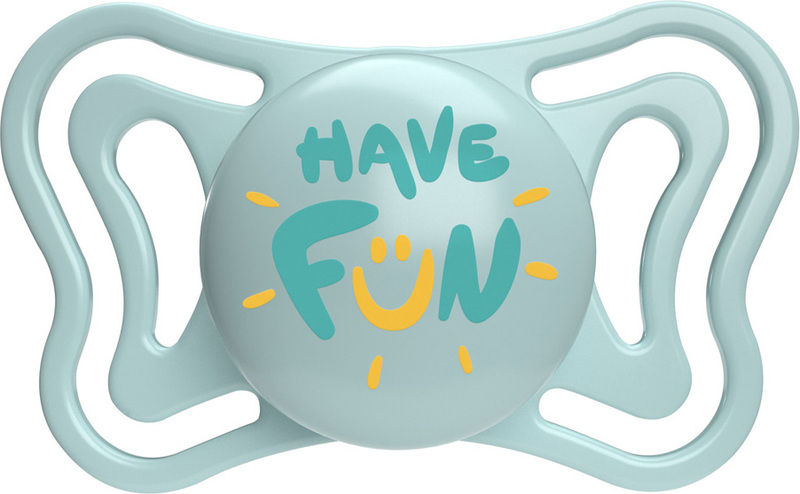• Die extrem weiche, verjüngte Basis des Schnullers ermöglicht es dem Kind, den Mund zu schließen und reduziert das Risiko ungleicher Zahnreihen (ist orthodontisch korrekt)