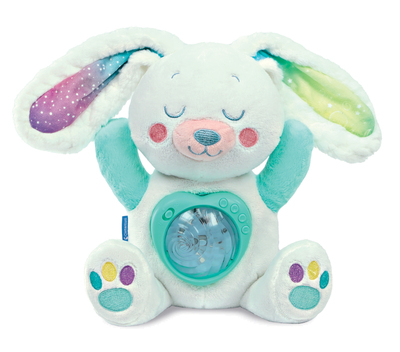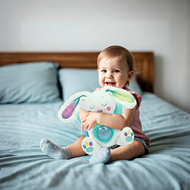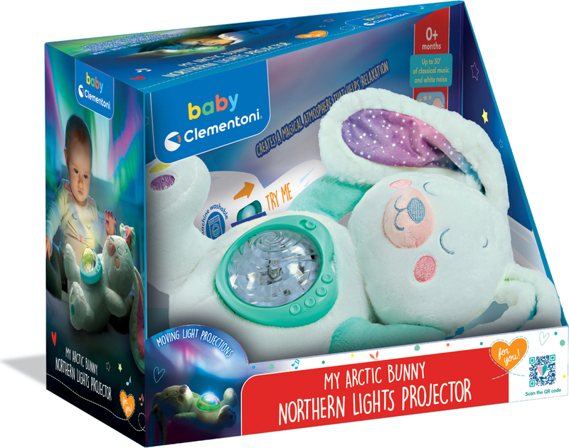 Der plüschige arktische Hase von Clementoni Baby schafft eine beruhigende Atmosphäre vor dem Schlafengehen, indem er ein wunderschönes Polarlicht an die Decke projiziert.