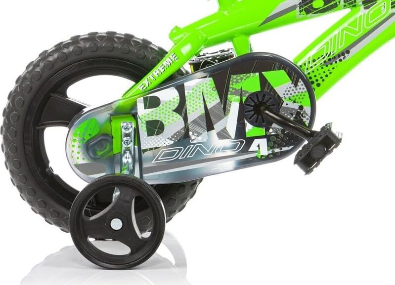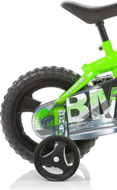 Kinder Fahrrad Dino BMX 12", Hersteller Dino Bikes Italy ist ein Sportfahrrad für kleine Rennfahrer. Die Räder haben einen Kunststoffreifen mit Vollgummi, was die Möglichkeit eines Plattens ausschließt und gleichzeitig die Wartung vereinfacht, da die Räder nicht aufgepumpt werden müssen. Das Fahrrad hat eine vordere Felgenbremse. Das Tretlager hat einen festen Gang, das sogenannte "Furtsschlap".