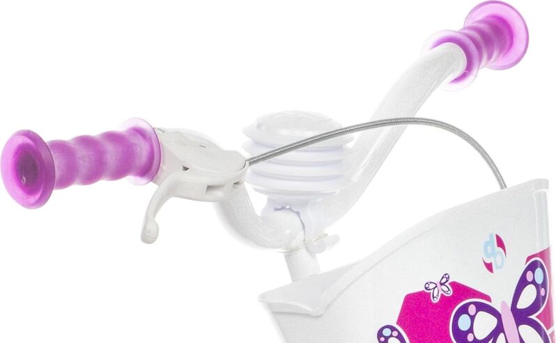- Das Fahrrad ist mit Hilfsrädern, einem Sitz für eine Puppe und einem Korb am Lenker ausgestattet.