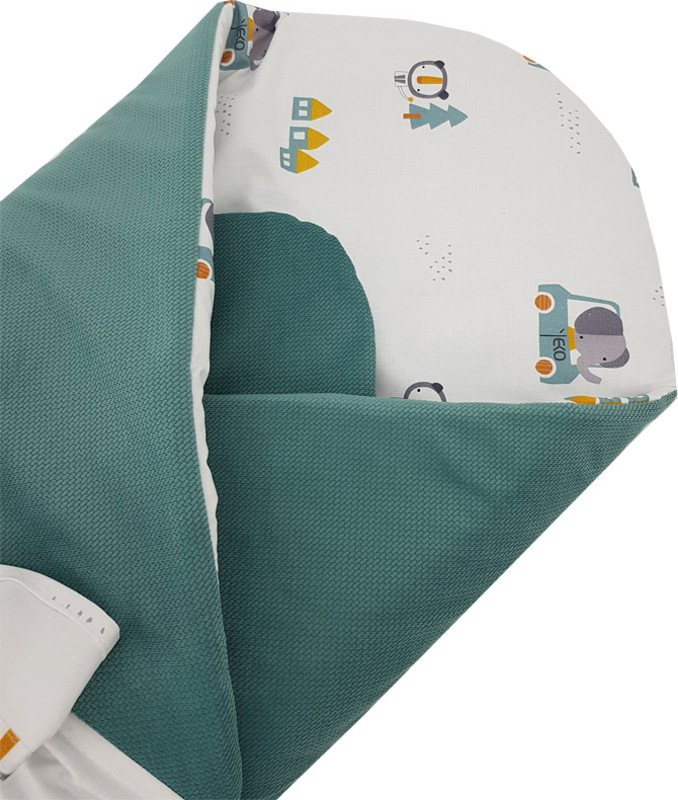 Swaddle aus hochwertiger digital bedruckter Baumwolle und VELVET-Material, gefüllt mit atmungsaktiver hypoallergener Faser. Schöne Farbe und höchste Qualität der Textilverarbeitung mit einem sehr weichen Griff schaffen ein einzigartiges Produkt der Premium-Linie. Er enthält eine Kokosnuss-Einlage, die den Eltern einen festeren Halt des Babys garantiert, was besonders in den ersten Lebenswochen wichtig ist.