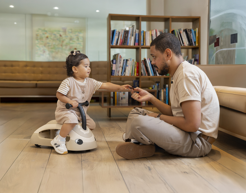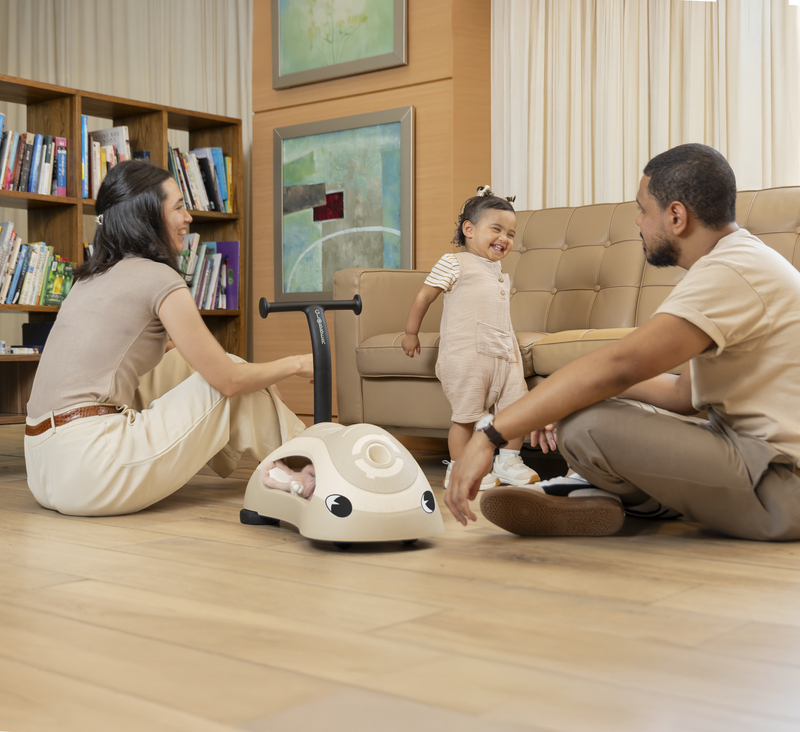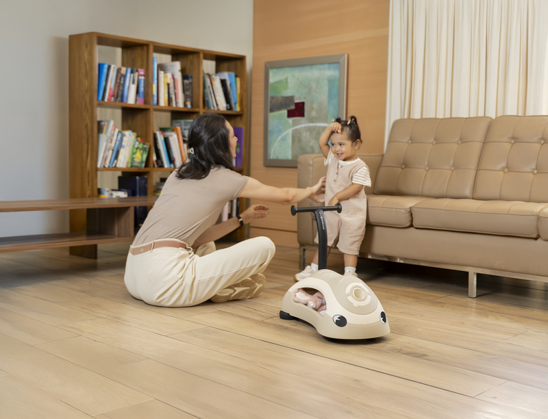 Dank des 2-in-1 Designs lässt sich das Spielzeug ohne Werkzeuge und mühelos von einem Laufrad (im Sitzen) in eine Gehhilfe (Stehen und Gehen) verwandeln. Man muss nur die Position der T-Lenker drehen und die speziellen Geschwindigkeitsregulierungsräder einstecken oder ausfahren. Die Räder bestehen aus TPE-Material, das eine sanfte und leise Fahrt gewährleistet, ohne den Boden zu beschädigen. Im Laufradmodus sind die Hinterräder eingezogen für eine gleichmäßigere Bewegung, im Gehhilfemodus sind sie ausgefahren und bieten mehr Widerstand, damit das Kleinkind in einem sicheren Tempo gehen kann. Der ergonomische Sitz und die Lenker aus strapazierfähigem Polypropylen (PP) bieten Komfort und Sicherheit bei jeder Benutzung. Unter dem Sitz befindet sich ein geräumiger Stauraum für Spielzeug und Babyutensilien. Im Lieferumfang sind 3 Sticker-Sets (zwinkernde Augen, wilder Blick, runde Augen) zur individuellen Personalisierung des Spielzeugs enthalten.