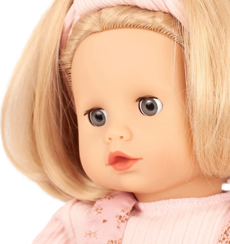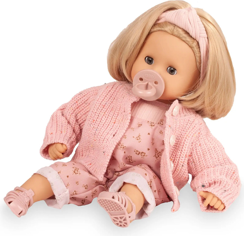 Muffin Millefleur ist eine liebevoll gestaltete Puppe mit blauen schließenden Augen und blonden Haaren. Ihr hochwertiges Outfit – Latzhose mit goldenem Blumenmuster, passendes T-Shirt, Haarband und Sandalen – besticht durch präzise Verarbeitung und Liebe zum Detail. Mit einem Schnuller und einem natürlichen Gesichtsausdruck lädt sie zu fürsorglichem Spiel ein und wird schnell zur vertrauten Begleiterin in der kindlichen Fantasiewelt.