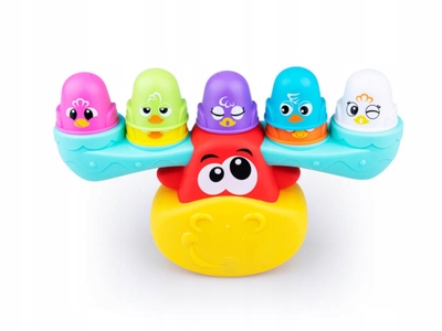 Platzieren Sie die bunten Becher auf den Geweihen des Elches, sodass keine Seite überwiegt! Wenn Sie zu viele Becher auf eine Seite stellen, kippt er in diese Richtung. Achtung, wenn Sie ihn mit einer zu schweren Last belasten und er sich zu weit zur Seite neigt, fallen die Becher herunter! Und das ist noch nicht alles! Die Becher-Vögel haben Löcher auf dem Kopf, wodurch sie auch für das Spiel im Sand oder beim Baden geeignet sind.