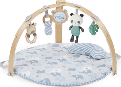 - 5 abnehmbare Spielzeuge: Silikonblatt, Plüschpanda, Holzring, Spiegel mit Löwen und Rassel mit Giraffe