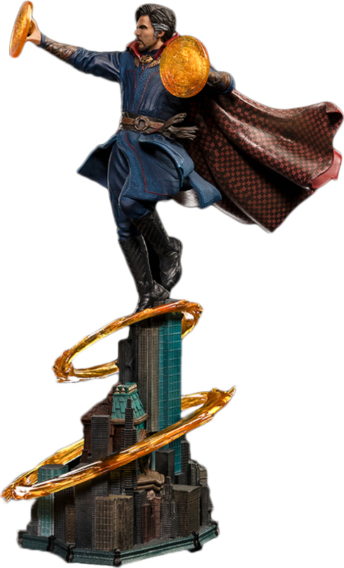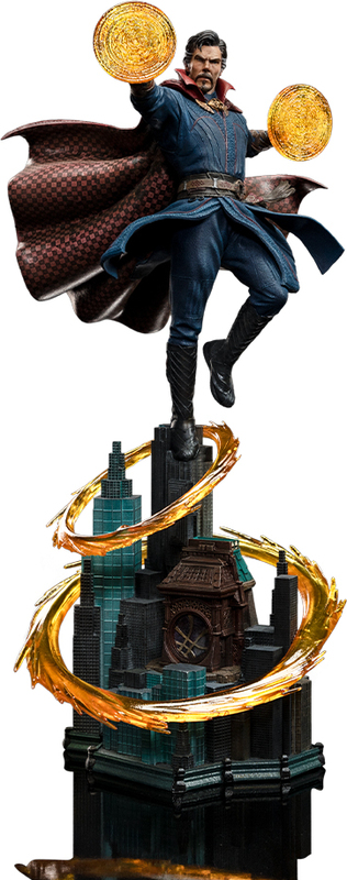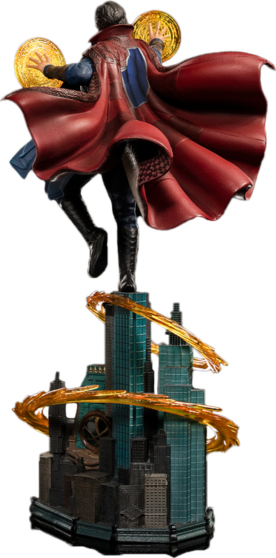 Die Figur schwebt mit Hilfe ihres empfindsamen Umhangs der Levitation und aus ihren Händen strömen Zauber in Form von durchsichtigen Mandalas. Die gesamte Komposition ist auf einem Sockel platziert, der die Miniatur der Stadt New York einschließlich des ikonischen magischen Anwesens Sanctum Sanctorum treu repliziert. Jedes Detail des Kostüms und der Gesichtszüge wurde mit maximaler Präzision nach dem Filmvorbild erstellt.
