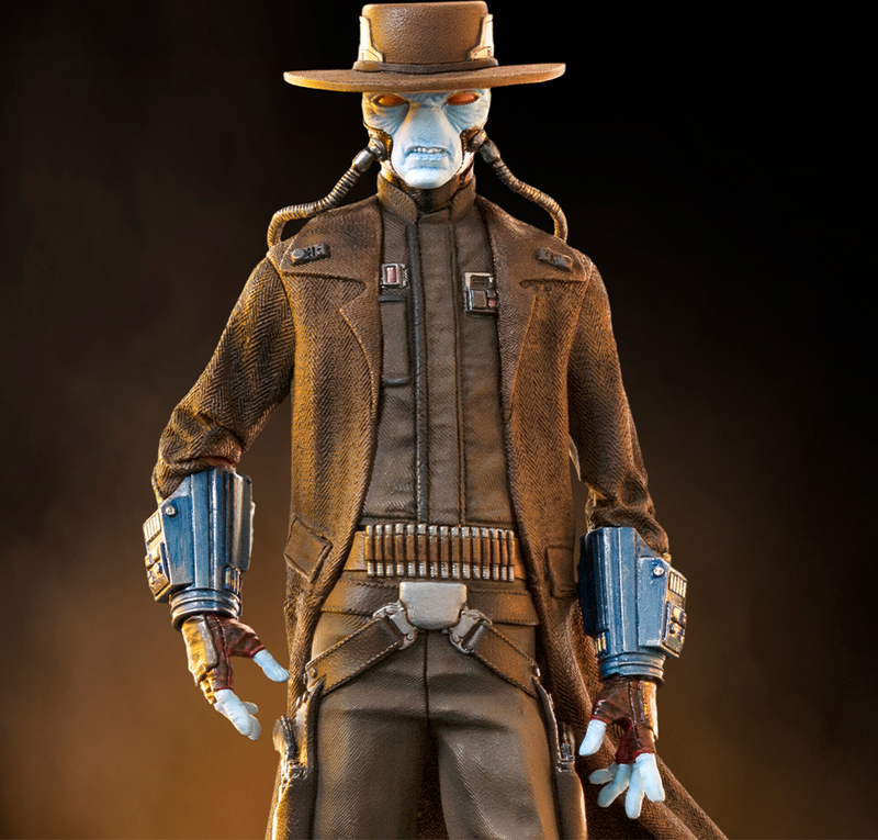 Cad Bane, gebürtig vom Planeten Duro, wird in der Pose eines klassischen Revolverhelden des Wilden Westens dargestellt, bereit, seine beiden Blaster-Pistolen LL-30 aus den Holstern an seinem Gürtel zu ziehen. Die Figur in einem braunen Mantel schreitet über den heißen Sand des Wüstenplaneten Tatooine direkt vor den Toren der Stadt Freetown. Als Waffenspezialist und Experte für Geräte, die gegen Jedi eingesetzt werden, hat er sich hohen Respekt im gesamten Untergrund sowie unter anderen Kopfgeldjägern erarbeitet.