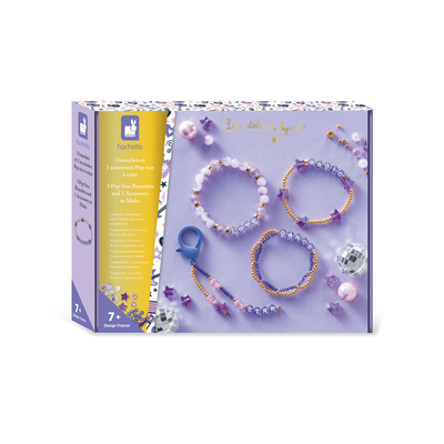 Werden Sie ein echter Popstar! Erstellen Sie 3 Armbänder und 1 Schlüsselanhänger, die Sie mit Freunden tauschen können, wenn Sie das Bedürfnis verspüren! Dank des beeindruckenden Inhalts (18 lila Perlen mit Buchstaben, 6 Perlen mit Sternen, 12 goldenen Metallperlen, 120 runden goldenen Metallperlen, 60 blauen Perlen, 4 Perlen mit rosa Facetten, 4 transparenten runden Perlen, 12 lila Perlen, elastischer Faden, lila Jadefaden, 1 Kunststoffkarabiner und 1 Broschüre mit Anleitungen und Mustern) ist dieses Set ideal für diejenigen, die Freundschaftsschmuck lieben. Diese Aktivität, die Kreativität und motorische Fähigkeiten fördert, dauert insgesamt 50 Minuten (plus/minus). Sie ist geeignet für Kinder ab 7 Jahren.Janod Atelier Schmuckherstellungsset Armbänder Popstar 3 Stück und Zubehör ab 7 Jahren