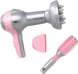 Das Set enthält einen batteriebetriebenen Haartrockner, der mit zwei Verlängerungen und einem Kamm bläst.