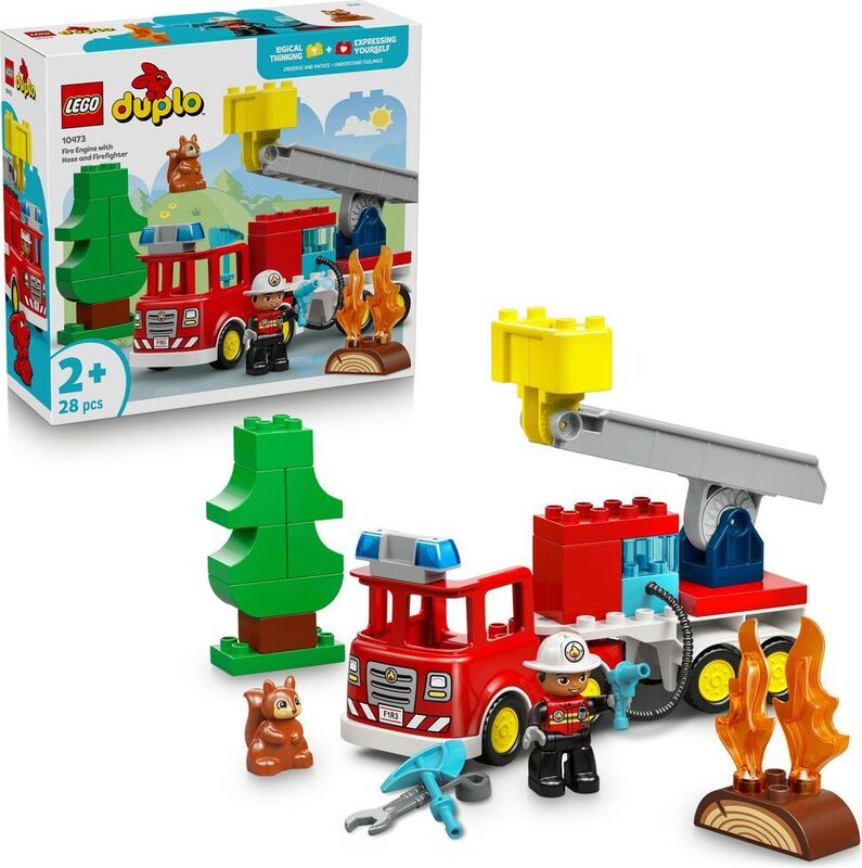 FEUERWEHRSPIELZEUG LEGO® DUPLO® – Mit diesem Spielzeug können Kleinkinder sich vorstellen, dass sie die Helden des Alltags sind, die von der Leiter aus einen brennenden Holzscheit mit dem Schlauch löschen, während das Eichhörnchen das Geschehen aus der Ferne beobachtet- VIELE UNTERHALTSAME ELEMENTE – Enthält ein Modell des Feuerwehrfahrzeugs mit abnehmbarem Anhänger, eine Feuerwehrmannfigur, ein LEGO® DUPLO® Eichhörnchen, eine Axt und eine Zange zur Unterstützung kreativer Rettungsspiele