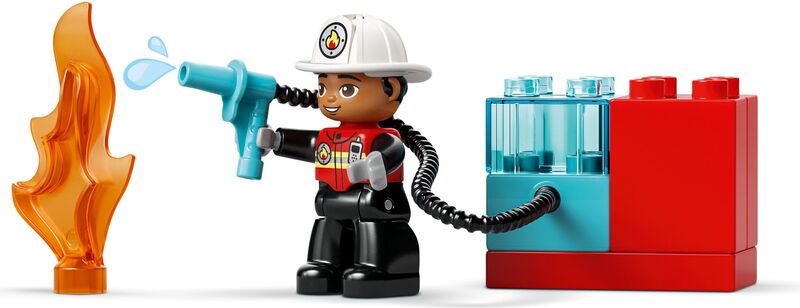 Es fehlt auch nicht an einer ausklappbaren Leiter und einem transparenten Wassertank aus LEGO DUPLO Steinen. Die angehenden Feuerwehrleute können so tun, als hätten sie den Schlauch angeschlossen, um ein Feuer zu löschen. Gleichzeitig entwickeln die Kleinkinder ihre feinmotorischen Fähigkeiten, während sie das Feuerwehrfahrzeug so umgestalten, dass der Anhänger flexibel ist, was das Fahren in Kurven erleichtert. Das Set enthält 28 Teile.