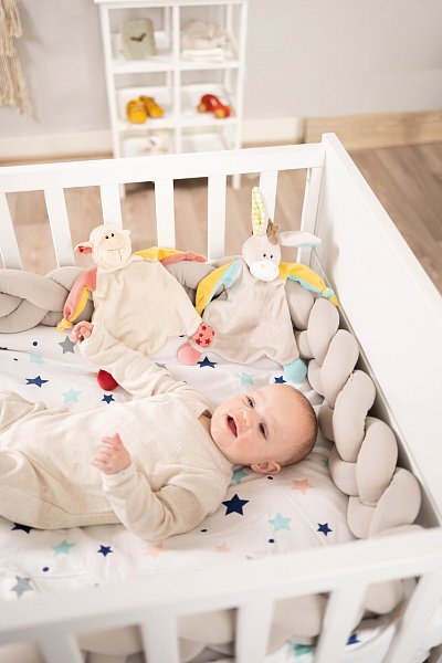 Der Schnuller ist aus flauschigem weichem NICI-Plüschmaterial gefertigt und dank kleiner Knoten und 3D-Details leicht von kleinen Kinderhänden zu greifen.