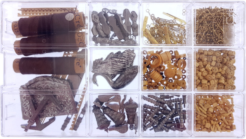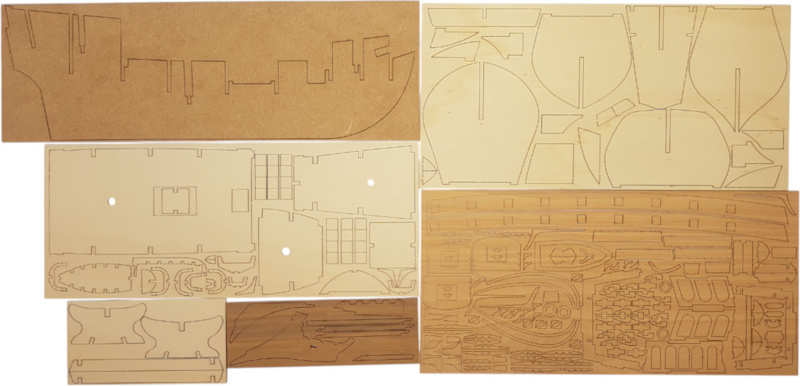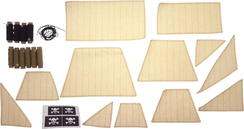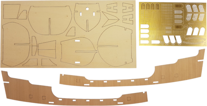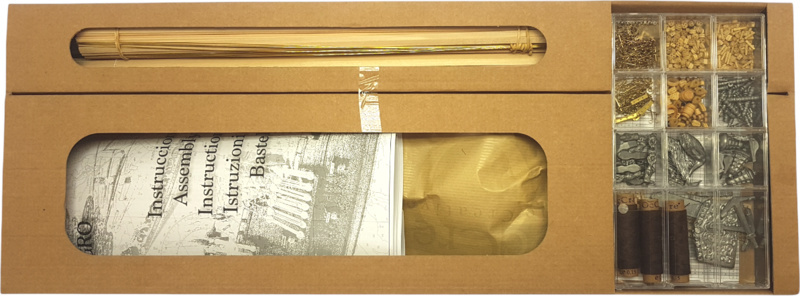 Die Verpackung enthält lasergeschnittene Flachholzstücke, Beplankungen, Masten, gefräste Holzstücke, Metallgüsse, Messingteile, messingfarbene Fotoleime, Rigging, genähte Segel, Flaggen, einen Ständer. Anleitung und Bauzeichnungen.