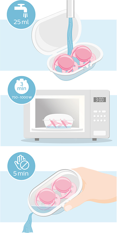 Schnuller sind für alle gängigen Sterilisationsmethoden geeignet. Bevor Sie die sterilisierten Schnuller berühren,