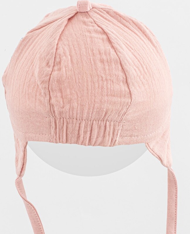 Sommer-Musselinmütze mit Schirm von New Baby. Die Mütze schützt den Kopf vor der starken Sonne und dank des Schirms, der Schatten spendet, wird das Gesichtchen nicht verbrannt und die Augen des Kindes werden vor der Sonne geschützt. Sie ist schön geformt für die Ohren, wird mit Bändern gebunden, drückt nicht und sitzt gut auf dem Kopf des Babys.