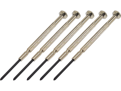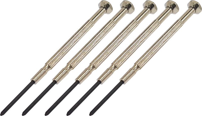 Uhrenschraubendreher Kreuz PH0 (5 Stück) ist für feine mechanische Arbeiten, kleine Schrauben in der Elektronik, Uhren, Brillen, RC-Modellen und in anderen Anwendungen geeignet. Metallgriff mit Riffelung und drehbarem Ende.