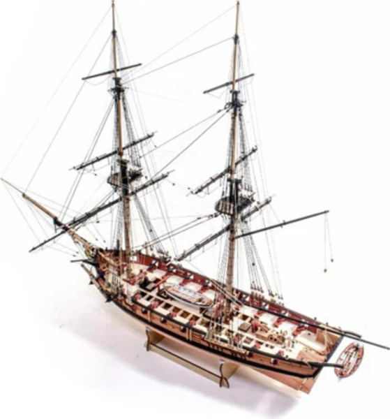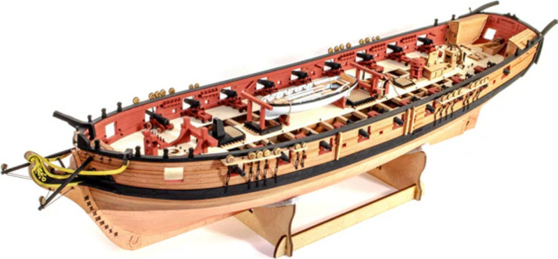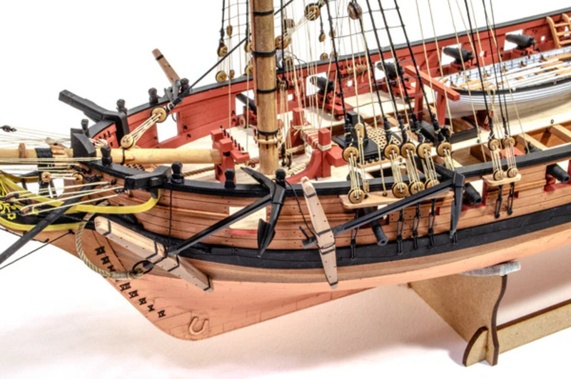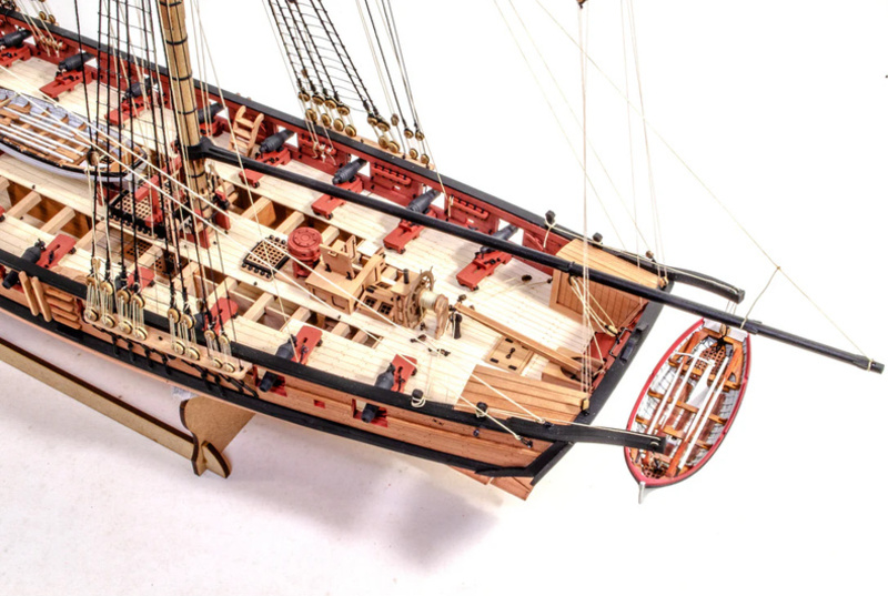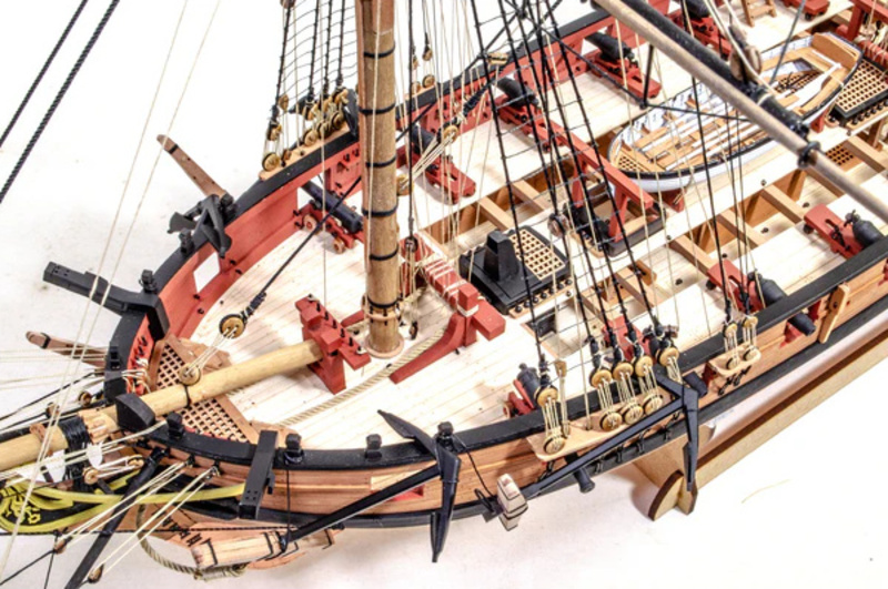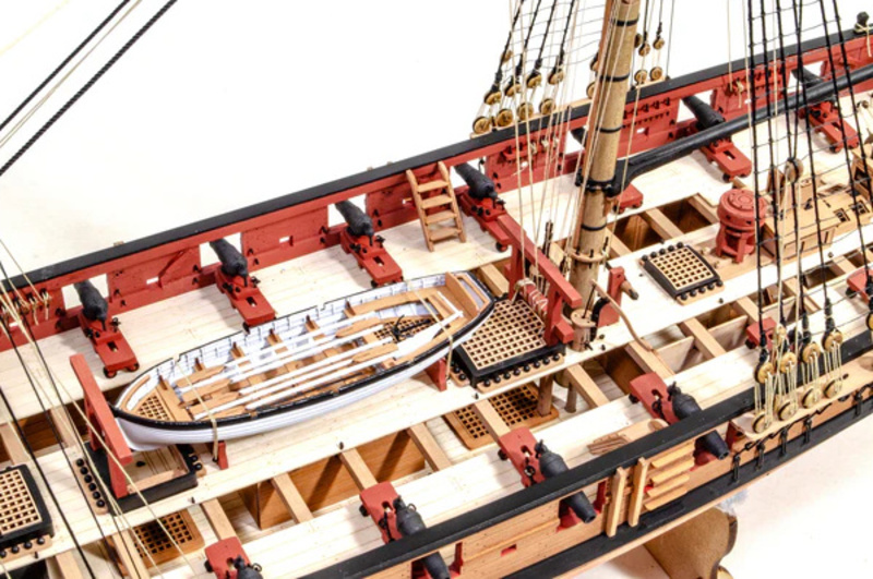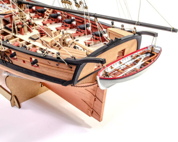 Das Paket enthält lasergeschnittene und gravierte Teile aus MDF und Birnbaumholz, Leisten aus Linden- und Birnbaumholz (zweite Beplankung), lasergeschnittenes und graviertes Deck, 3 Messingplatten mit fotogeätzten Teilen, Masten, Blöcke, Ringe und Seile für die Takelage, Holzkomponenten und 3D-Druckteile. Umfassende, farbige Gebrauchsanweisung zusammen mit 16 Zeichnungen des Modells im Maßstab und Details im Format A1 - Handbuch EN.