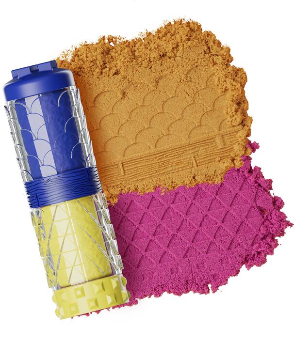 Nachhaltige Verpackung. Jeder Behälter mit Knete ist Teil des Spielerlebnisses mit Mustern, Stempeln und mehr.
