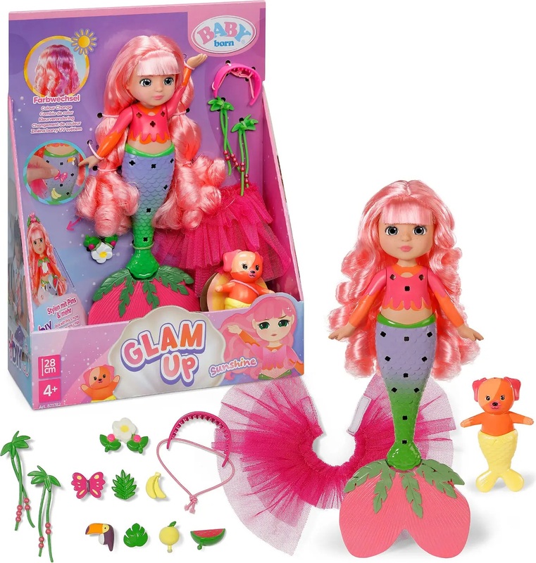 S BABY born Glam Up Mermaid Sunshine wird jede Stylinganpassung zu einem Abenteuer! Ihre rosa Haare ändern magisch die Farbe in der Sonne und ihr Körper kann immer wieder mit bunten Haarnadeln und Stoffaccessoires verändert werden – für endlose Stylingmöglichkeiten mit allem, was Ihnen in die Hände fällt.